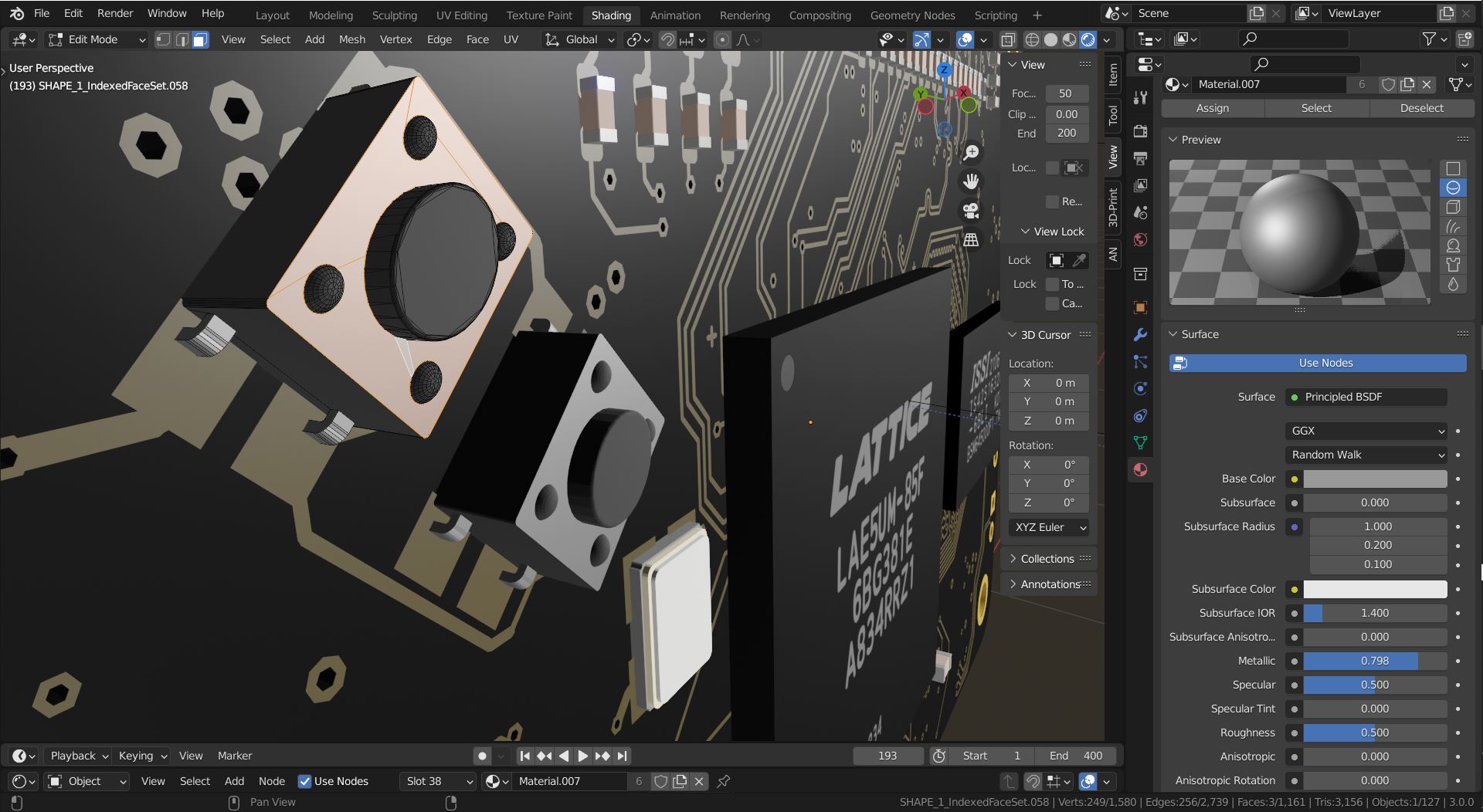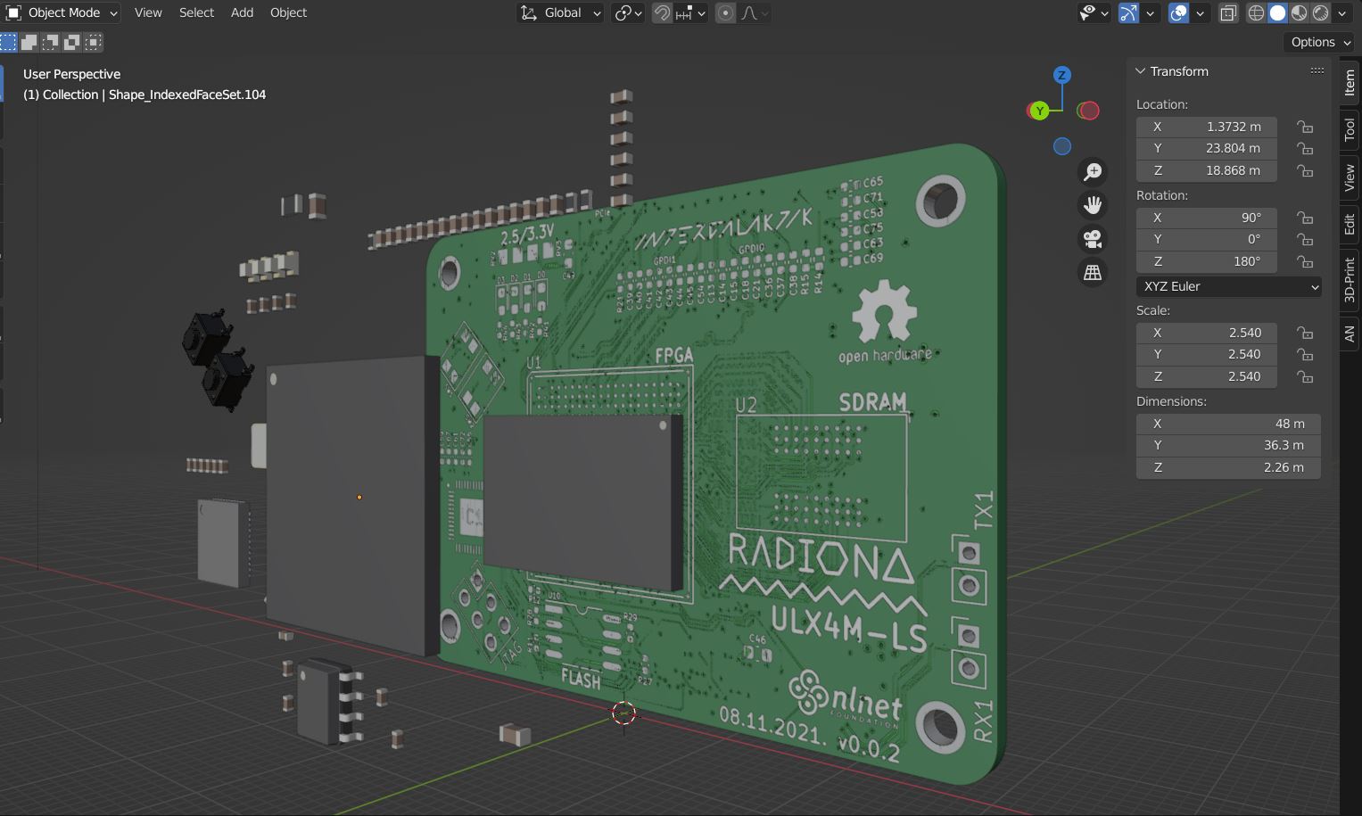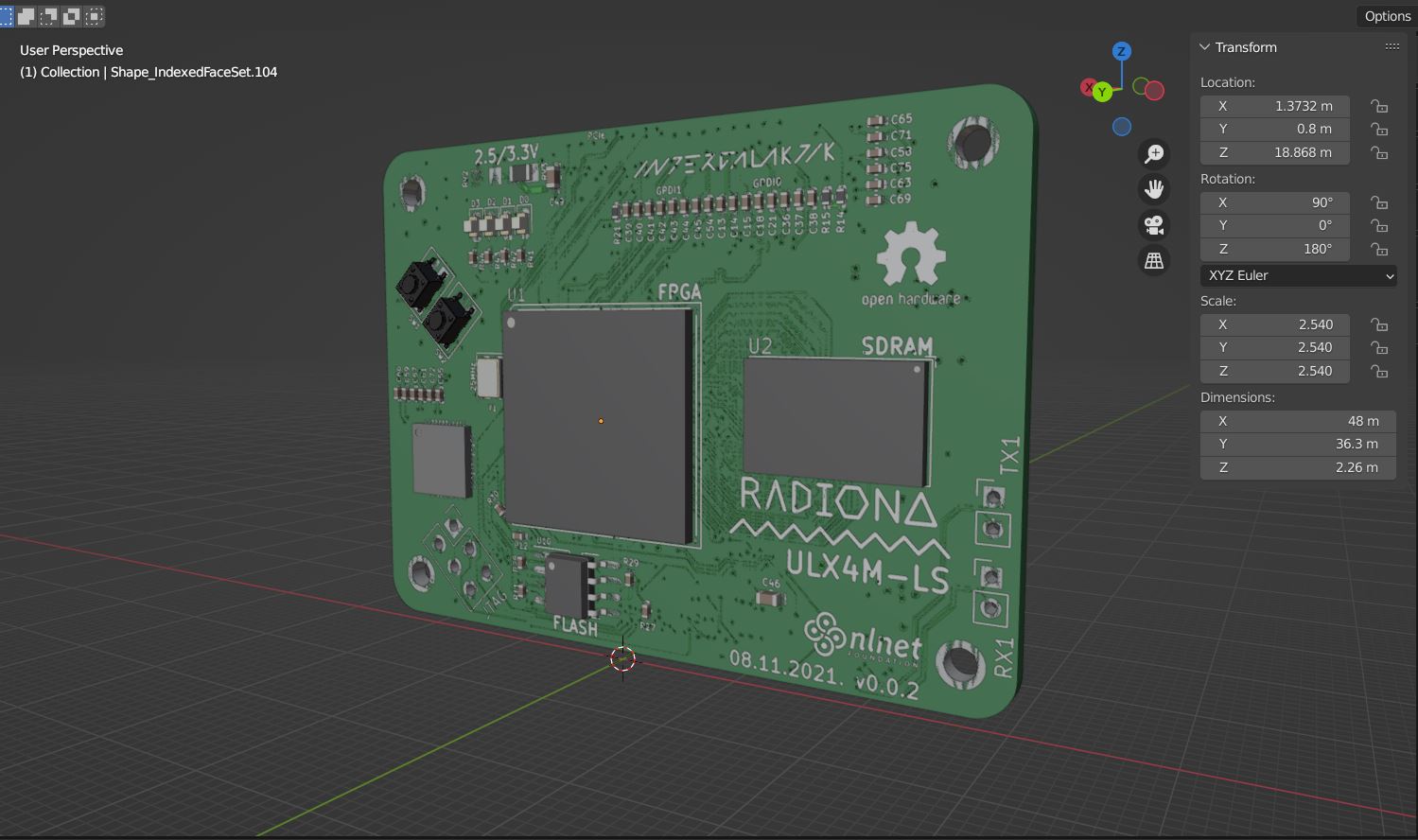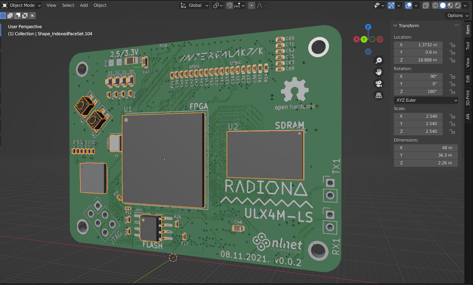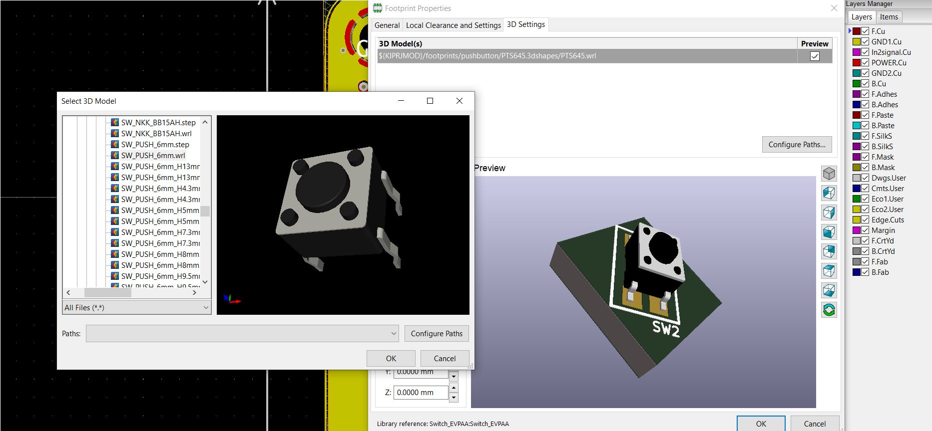 While importing wrl.file into the Blender we noticed that buttons are missing even though we could see them in the KiCad 3D view. By selecting cooper footprint and pressing "e" on keyboard, the footprint properties panel will open. Under 3D setting there are links for buttons which should be relinked or changed for some other design. Components that you may use are listed on the File icon below the links and under the package Button switch.