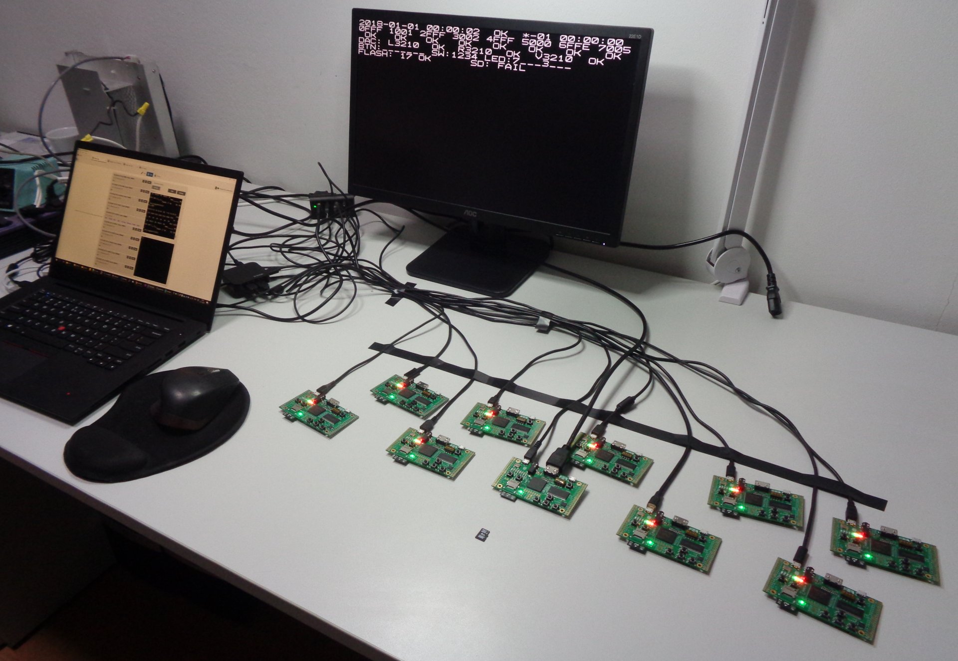 It is possible to test up to 10 boards simultaneously connected to a USB hub. The test procedure assigns a unique serial number to each ULX3S board, which is stored along with information about each test step in the PostgreSQL database for further analysis and debugging.