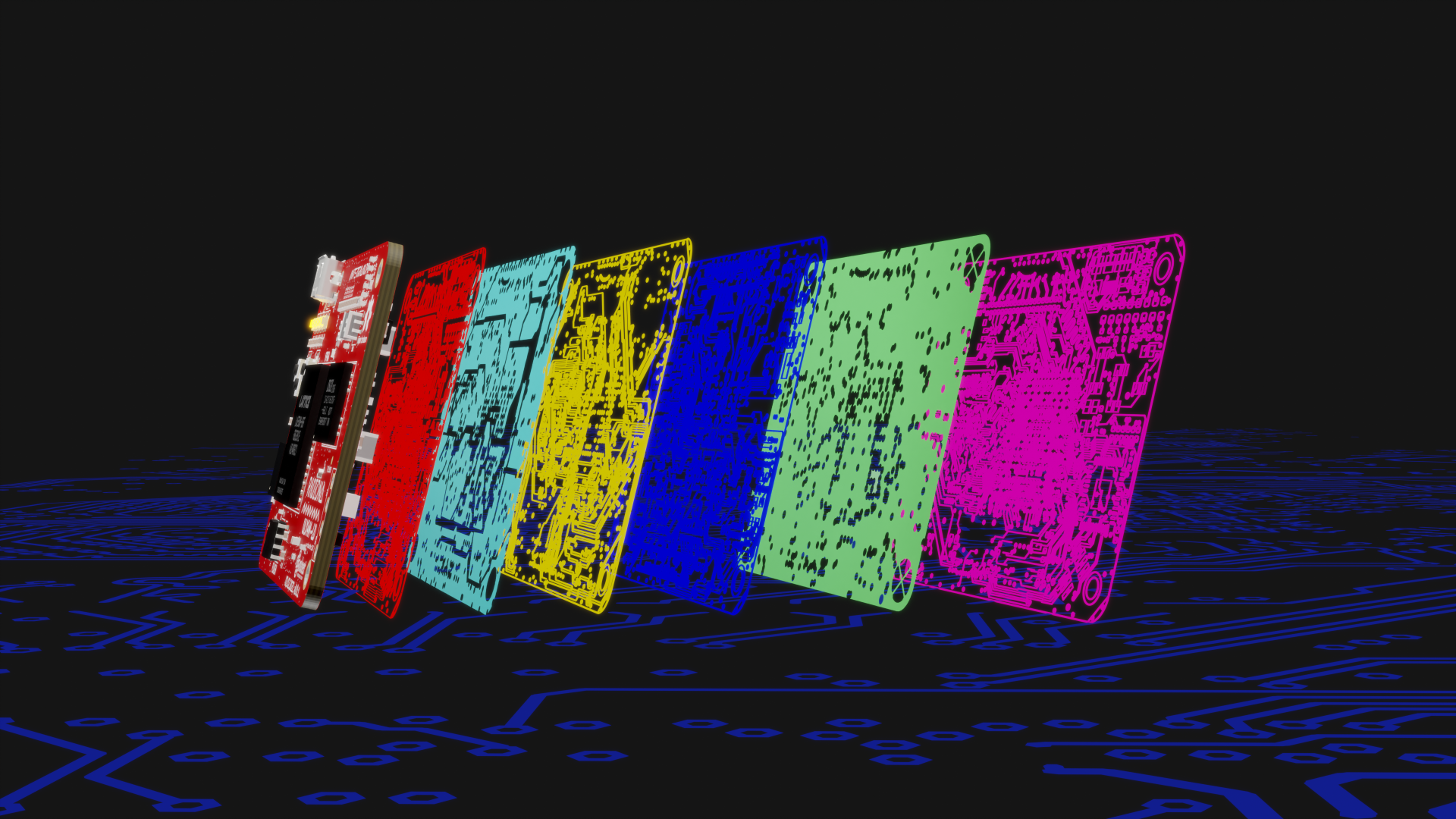 I wanted to use the pattern of one layer of the board to create a scene or space in which it will be placed. The pattern looked good as a base on the scene. I tried to place it as a background, but it was not neutral enough and does not interfere with the board as the main object. Due to the depth of the scene and the position of the camera, it was necessary to increase the number of patterns, so I joined several of the same layers into one. I set the color to emission to get brighter lines and the world color to black because it contrasts well with all the other luminous objects. The pattern is placed vertically in front of the camera and in two keyframes it descends as a base on which the board appears and slides towards the foreground.