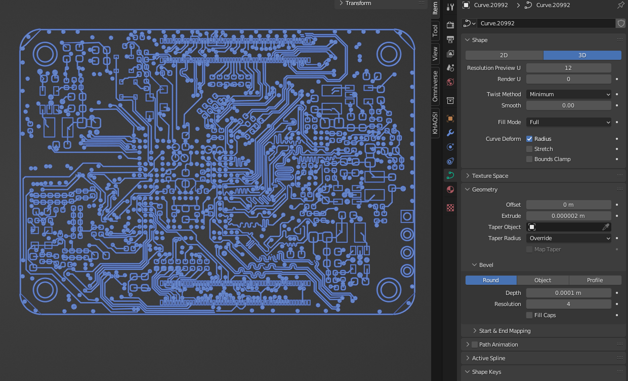 First they are exported from Kicad as svg. file and imported into the Blender. The layer contains a lot of small parts that need to be joined (Ctrl+J) and then converted into a mesh in order to clean the geometry from unnecessary surfaces.