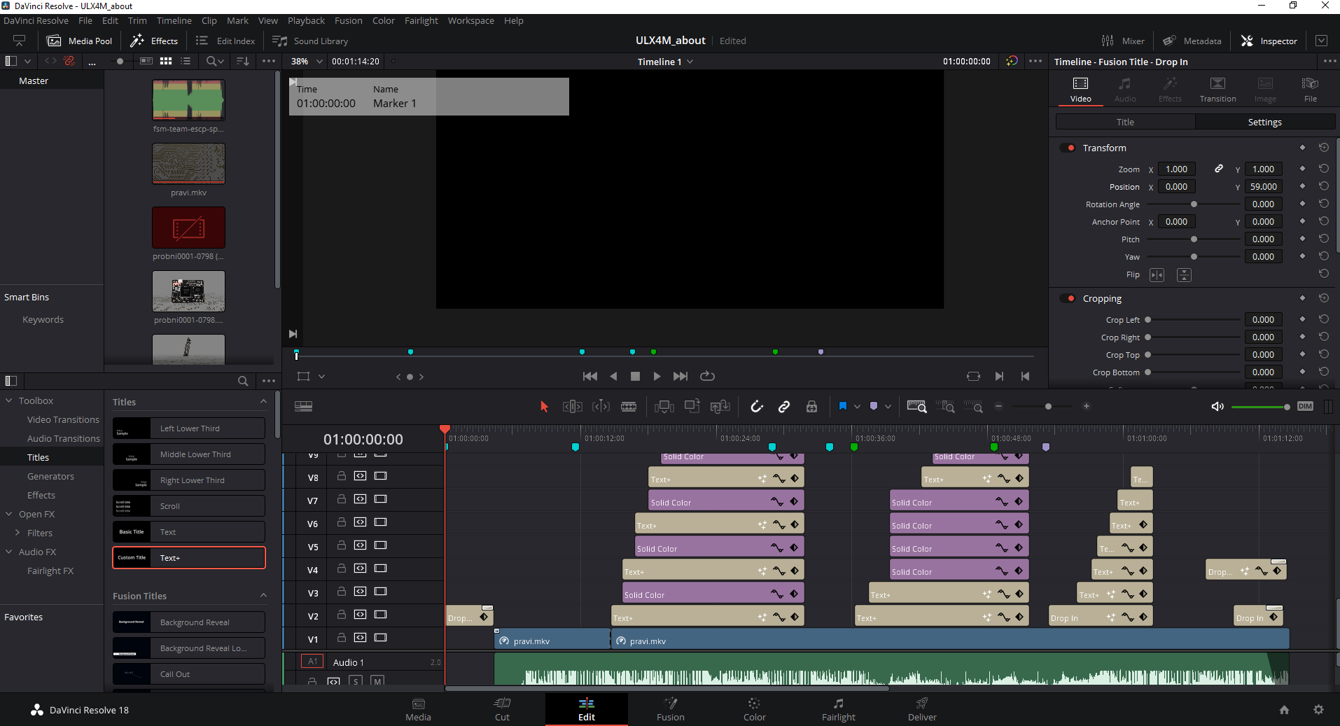 We move to the Edit workspace. To set the title layer in the Toolbox menu, select Titles - there is a menu on the right side and select Text+ because it gives us some options that ordinary Text does not have such as examples of motion. We drag Text+ to the timeline above the video layer, by dragging the right edge of the layer we correct the duration.
