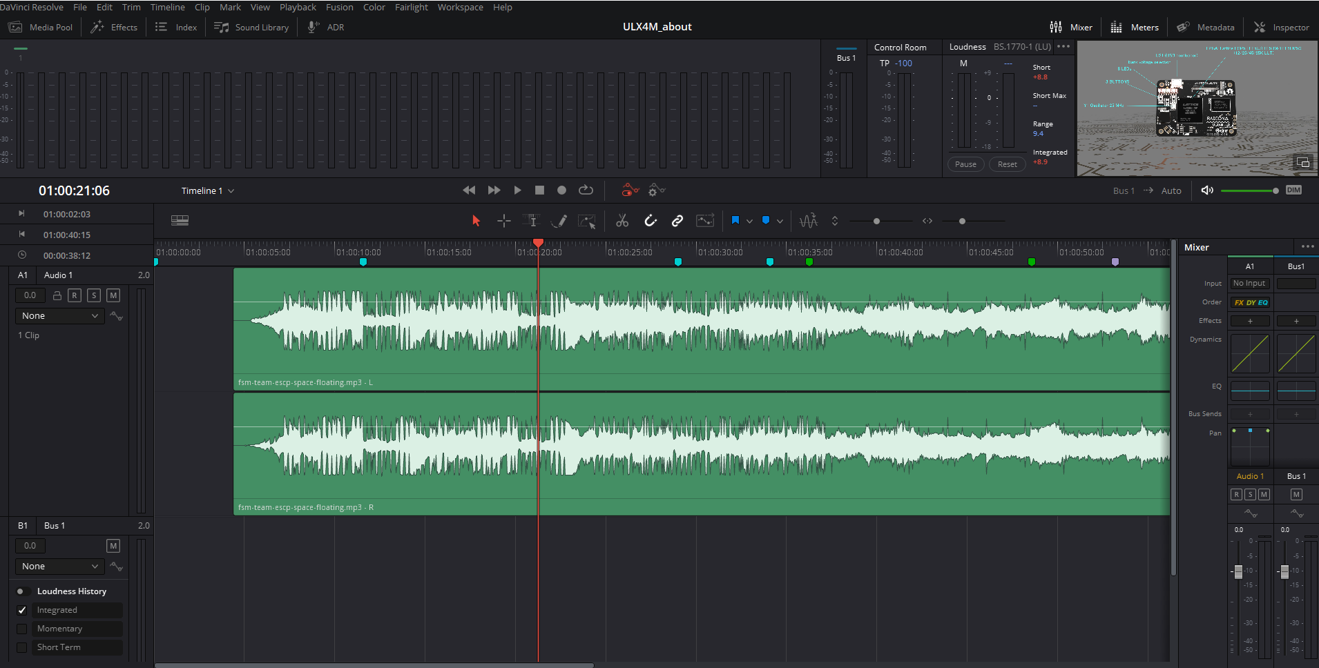Fifth step - importing music. We import the audio in the same way as the video clip, we place it under the video layer on the timeline, that is, the Audio 1 section. By moving to the left or right, we set the time at which we want the sound to start. With the Blade Edit mode icon, we take the cutting tool and use it to break the tapes where we want to end. Also applies to video tape cutting. In the Fairlight workspace, we can make corrections on the audio track. In this case, we want to correct the volume in general. By raising and lowering the white line on the audio bar, it will allow you to decrease and increase the volume of the entire track.
