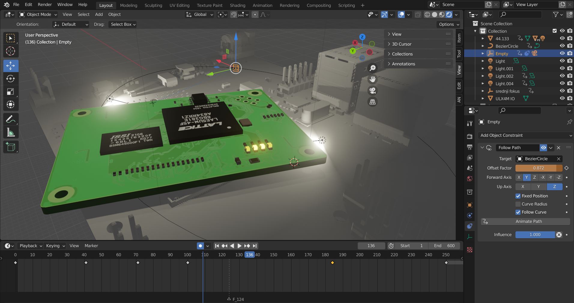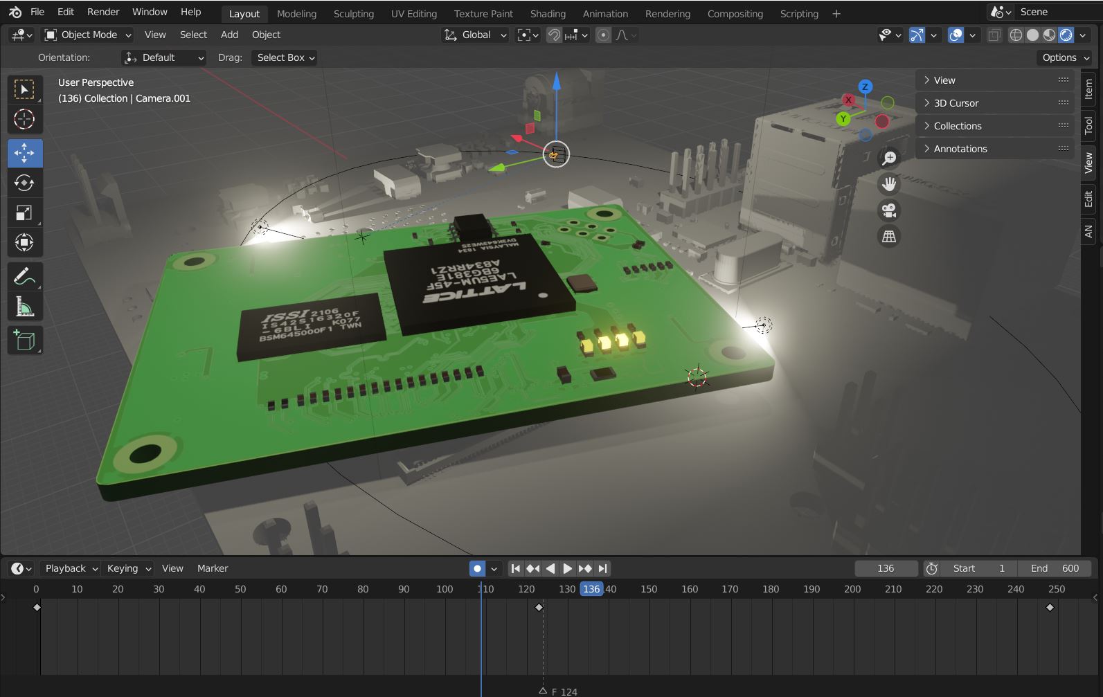 This part mostly happens in Edit mode where you can reach each vertex, edge and face of the component. I did some basic colouring in Material Properties - created new material slot with similar surface properties as original ULX4M board.
