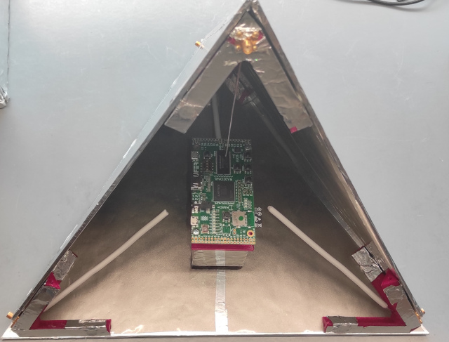 Each peek of the pyramid has an antenna, and we could use those antennas to measure the DUT (device under test) from different angles without rotating.