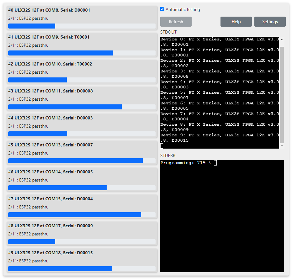 It is possible to test up to 10 boards simultaneously connected to a USB hub. The test procedure assigns a unique serial number to each ULX3S board, which is stored along with information about each test step in the PostgreSQL database for further analysis and debugging.