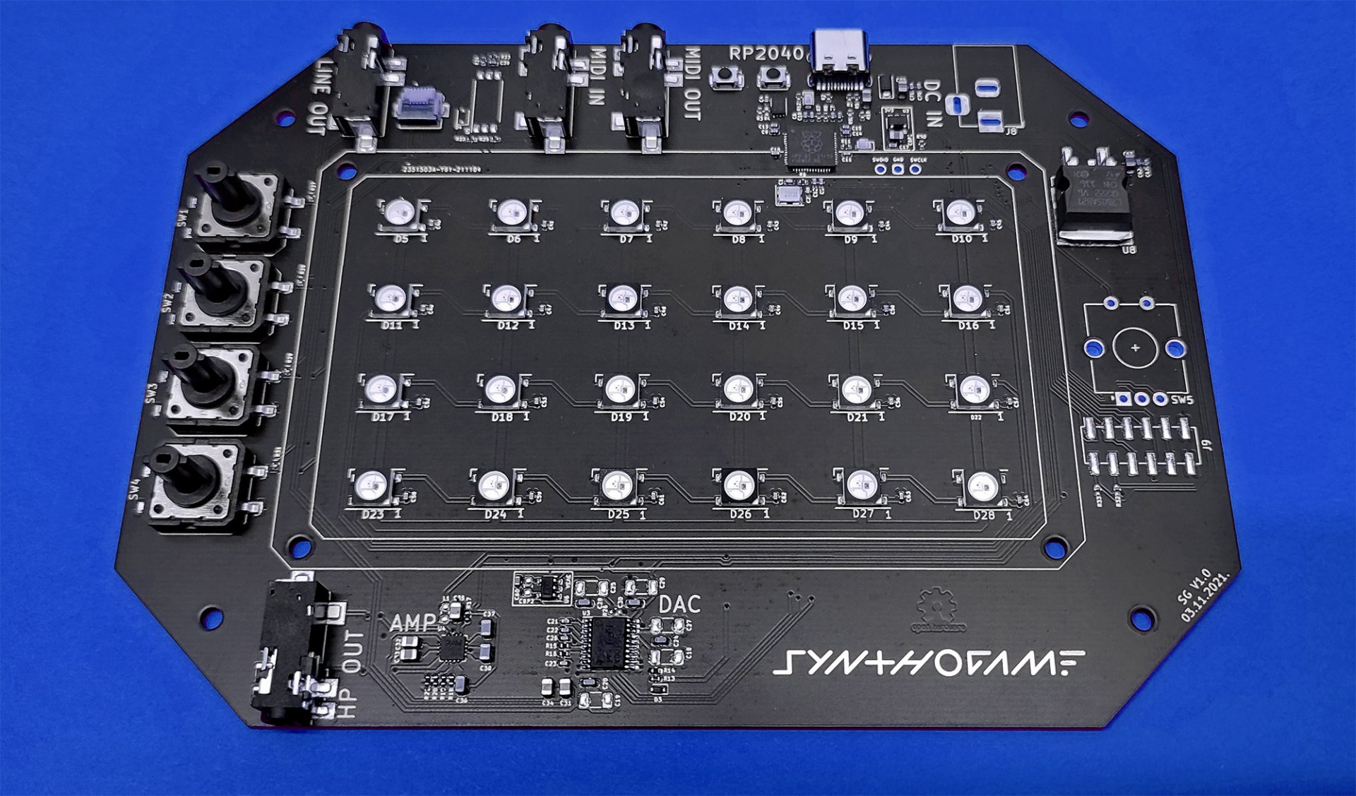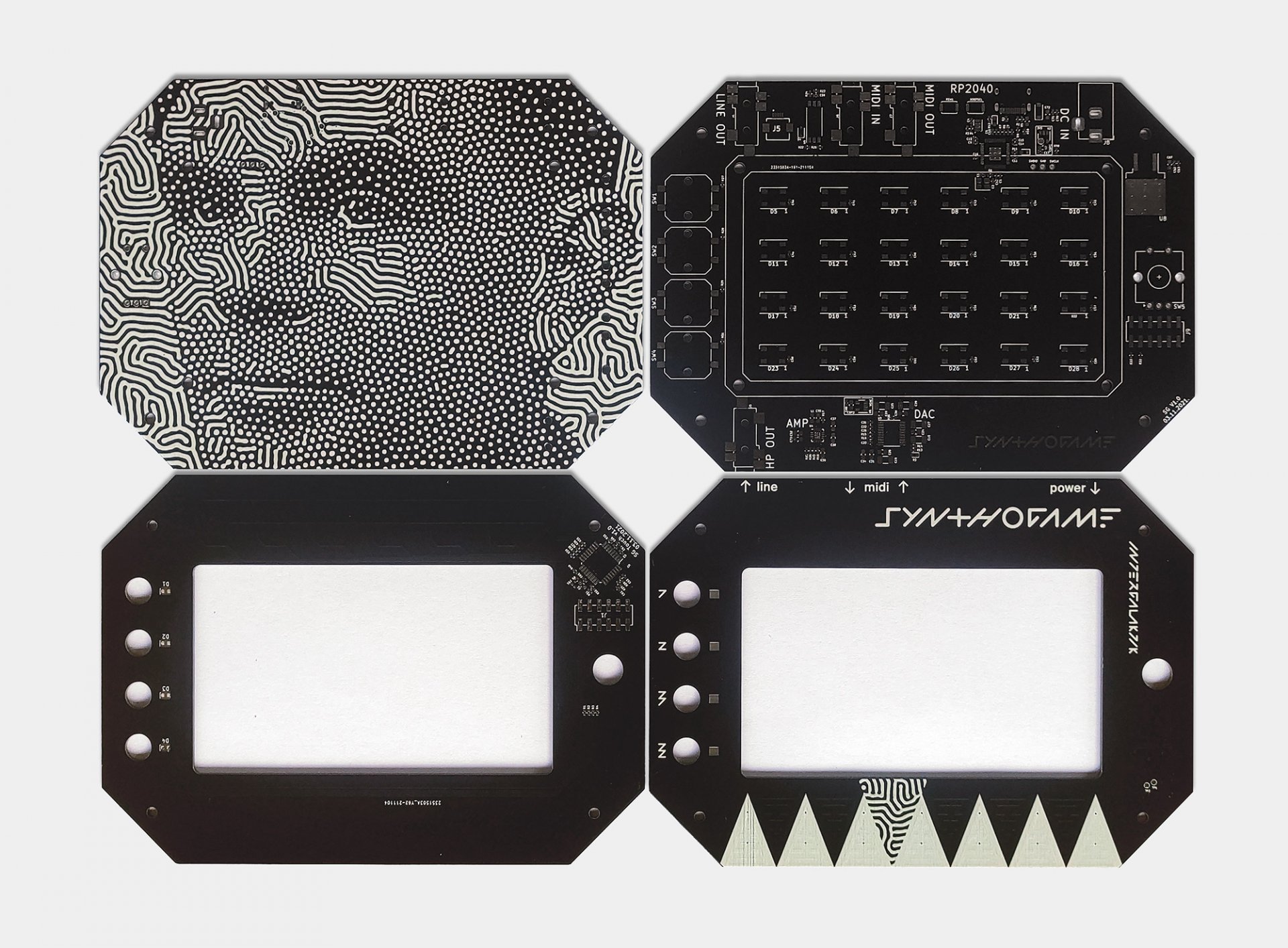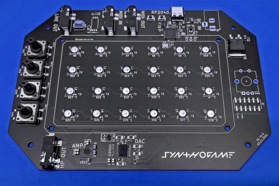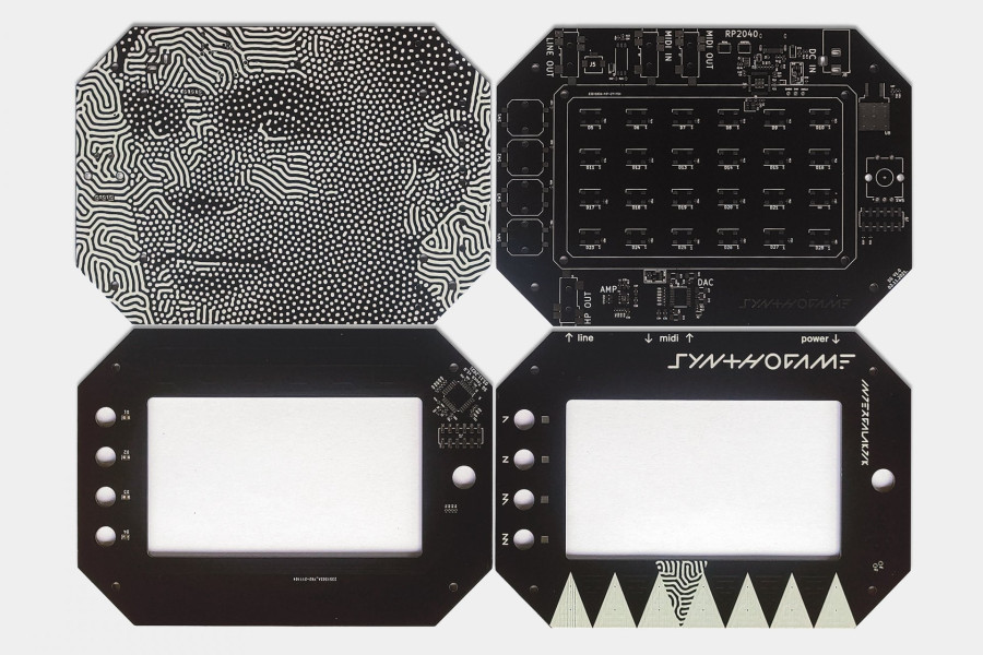 Besides RP2040 microcontroller Synthogame contains USB-C connector (power and communication), DAC (Digital Analog Converter), headphone amplifier, LINE OUT, MIDI IN/OUT, addressable RGB LED array, indication leds, buttons, encoder, touch buttons and touch screen.