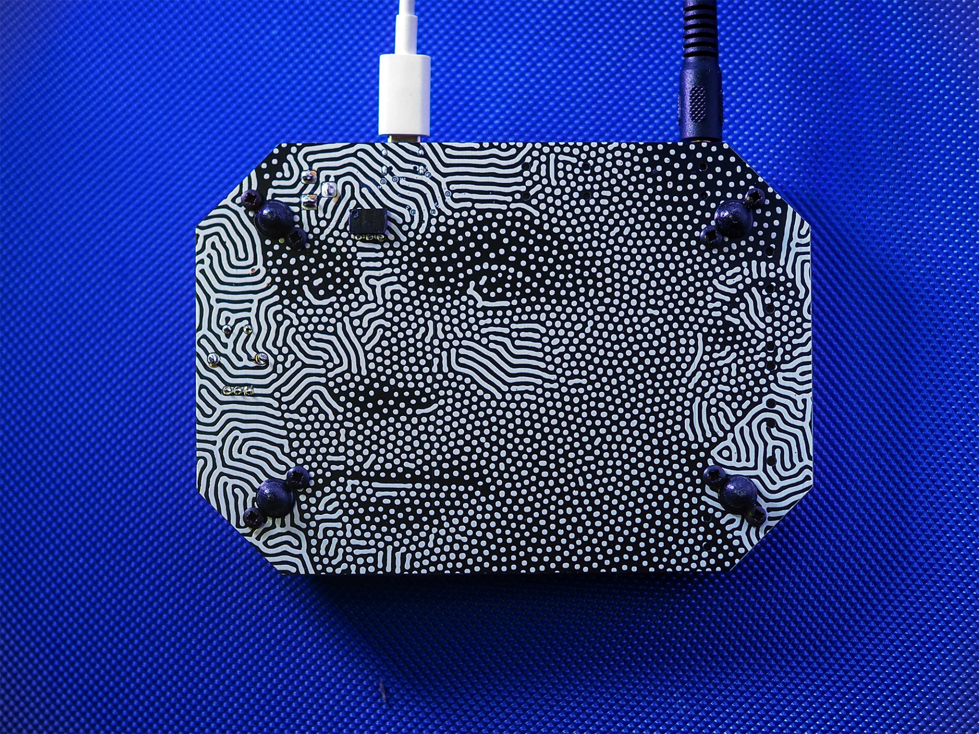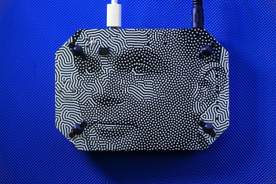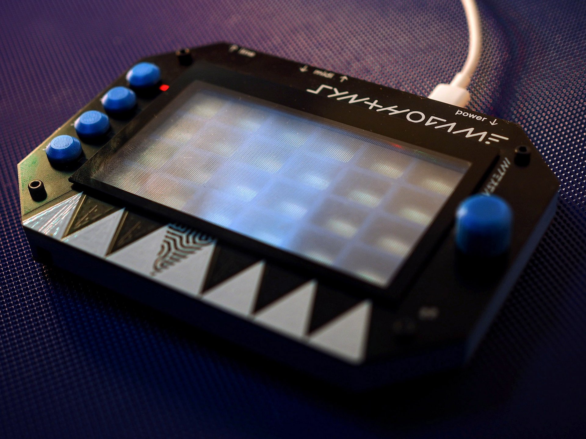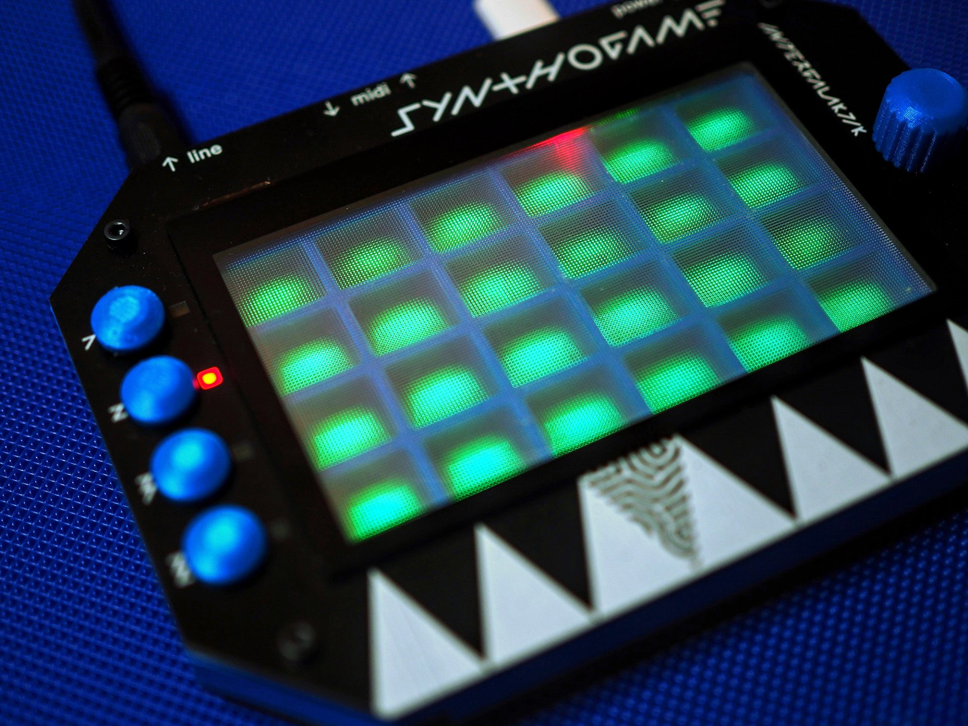 Besides RP2040 microcontroller Synthogame contains USB-C connector (power and communication), DAC (Digital Analog Converter), headphone amplifier, LINE OUT, MIDI IN/OUT, addressable RGB LED array, indication leds, buttons, encoder, touch buttons and touch screen.